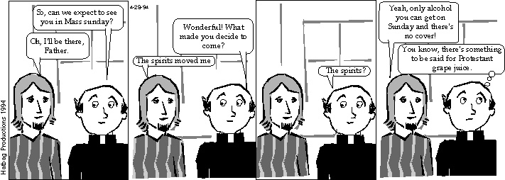 After we had drawn this one, turned it in, and gone home, we got a call from the then-editor of the DM, Anna DeMarco, asking us what we thought we were doing. She refused to publish the strip, and made us come back in and draw a new one. Best we could gather from her explanation, this one just kind of hit too close to home (she couldn't really explain how it differed from other strips we had done to this point, other than the group involved). She later explained that it would be her policy as editor to censor anything she personally found offensive, which is kind of interesting policy, in our minds. The ironic thing is, a Catholic friend showed it to the local priest, who thought it was funny and kept a copy of it.