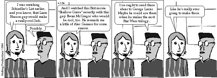 We drew this strip while desperate for an idea after wasting too much time dream-casting the theoretical "prequel trilogy" that we just knew in our hearts George would make. After failing miserably to come up with a funny punchline to go with our great ideas, we decided not to run it. Now I kind of wish we had.