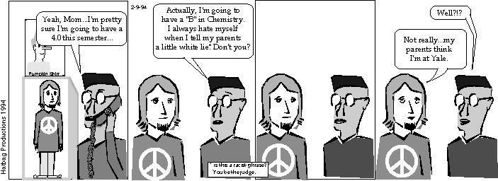 First off, contrary to popular belief, Hippie is not in a box on Black Guy's table in the first panel.
