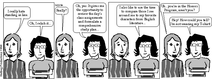 This one was actually used on T-shirts by the Honors Program at Ole Miss, which was very cool, especially since we got free shirts. It's also the first example of the fact that Hippie apparently re-parts his hair when he turns his head.