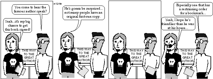 This strip was actually written during the keynote of the first ever Oxford Conference for the Book. The keynote speakers, by the way, were John Grisham and Stephen King (The moderator was Barry Hannah, for those familiar with his work).