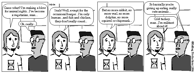 David's brother-in-law Steve, then just a DM co-worker and friend of the Hatbag family, became a vegetarian for medical reasons around this time, inspiring some of Hippie's herbivorous misadventures.