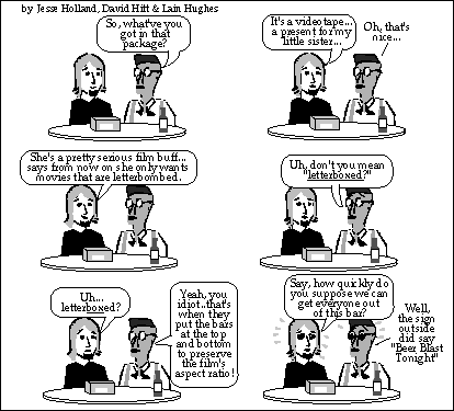 Hopefully the rising popularity of DVD will make widescreen movies commonplace. A couple of years before this strip, David went into a movie store in Tupelo and asked if they had a letterboxed copy of Star Wars. The clerk told him that they usually carried Star Wars in a box, but they didn't have it right then. That store is closed now, and rightfully so.