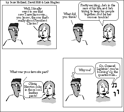 In case you've forgotten, "Primary Colors" and the re-release of "Grease" were in theatres at the same time. Thus the joke.