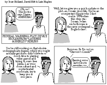 This strip was done when we were picked up (albeit briefly) by the student newspaper at University of Alaska Fairbanks as an introduction to the strip without having to go back and rerun the first strips.
